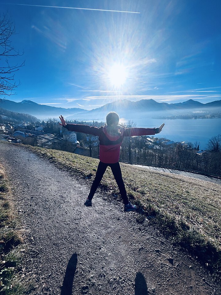 Dieses Foto ist mein Lieblingsfoto, weil es für mich Freiheit, Lebensfreude und Zusammenhalt bedeutet. Zu sehen ist meine Schwester am Tegernsee. Sie steht mit ausgebreiteten Armen auf einem Hügel und blickt in die Sonne. In diesem Moment wirkt es, als würde sie die ganze Welt umarmen. Die Landschaft mit dem See und den Bergen im Hintergrund macht das Bild besonders. Das Licht der Sonne strahlt so stark, dass alles fast magisch aussieht. Für mich zeigt dieses Foto nicht nur eine schöne Aussicht, sondern auch ein Gefühl – das Gefühl, draußen zu sein, die Natur zu genießen und einfach glücklich zu sein. Ich verbinde mit diesem Moment einen besonderen Tag mit meiner Familie. Deshalb ist dieses Bild für mich mehr als nur ein Foto – es ist eine Erinnerung an Freiheit, Familie und einen perfekten Augenblick.