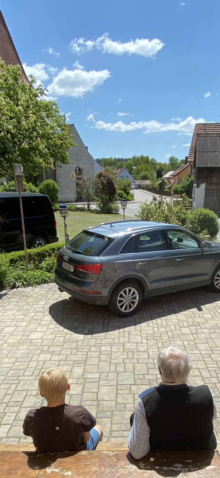 Ich sitze mit Opa vor unserem Gasthof und wir genießen den Frühling mit seinen ersten warmen Sonnenstrahlen.