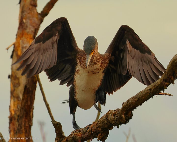 Dieses Bild veranschaulicht, wie ein Kormoran seiner Beute auf einem Zweig am nahen Uferrand auflauert.